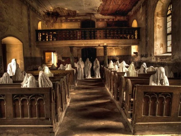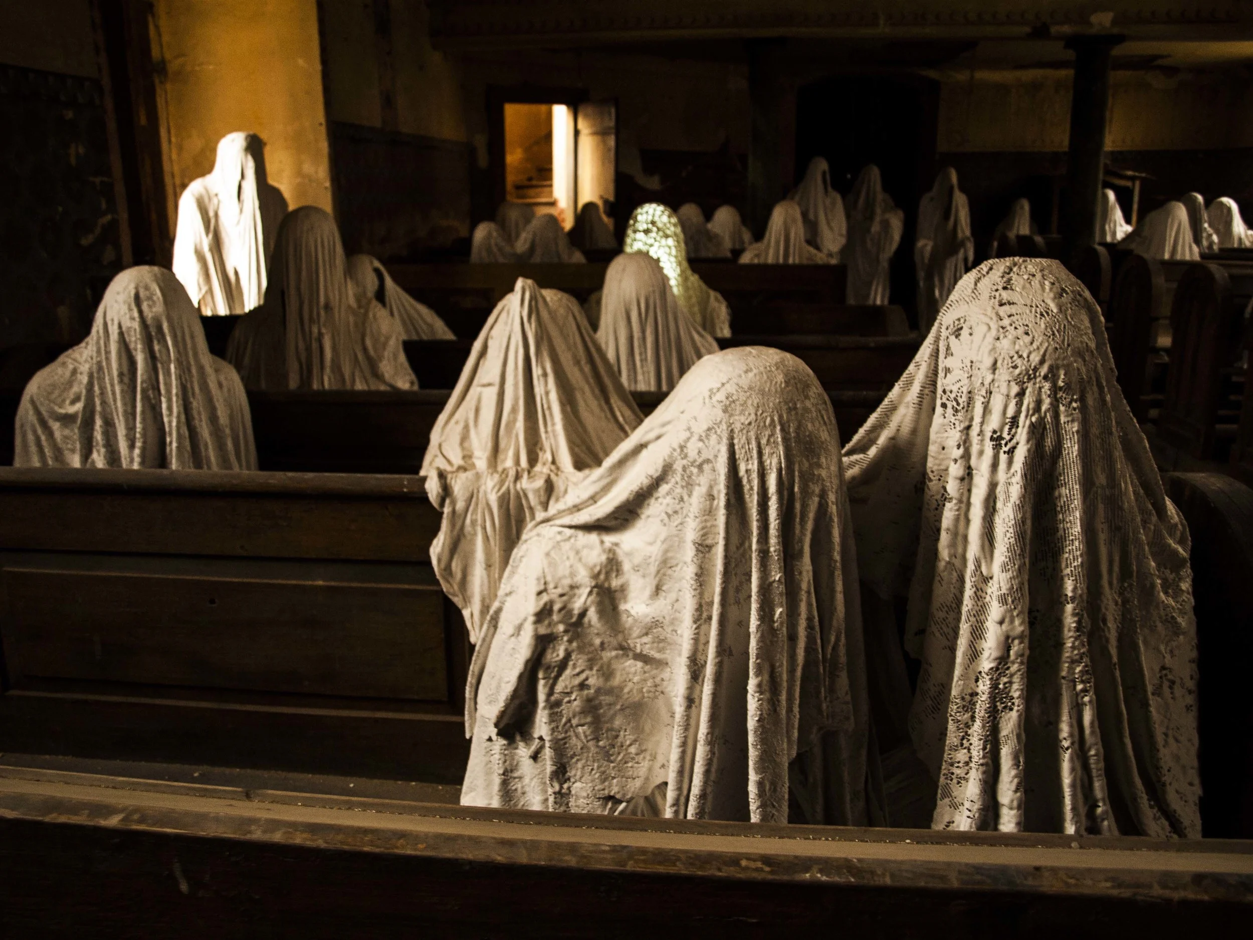 The ghosts are made out of plaster and fill the pews and the aisle of the church, which was built in 1352.