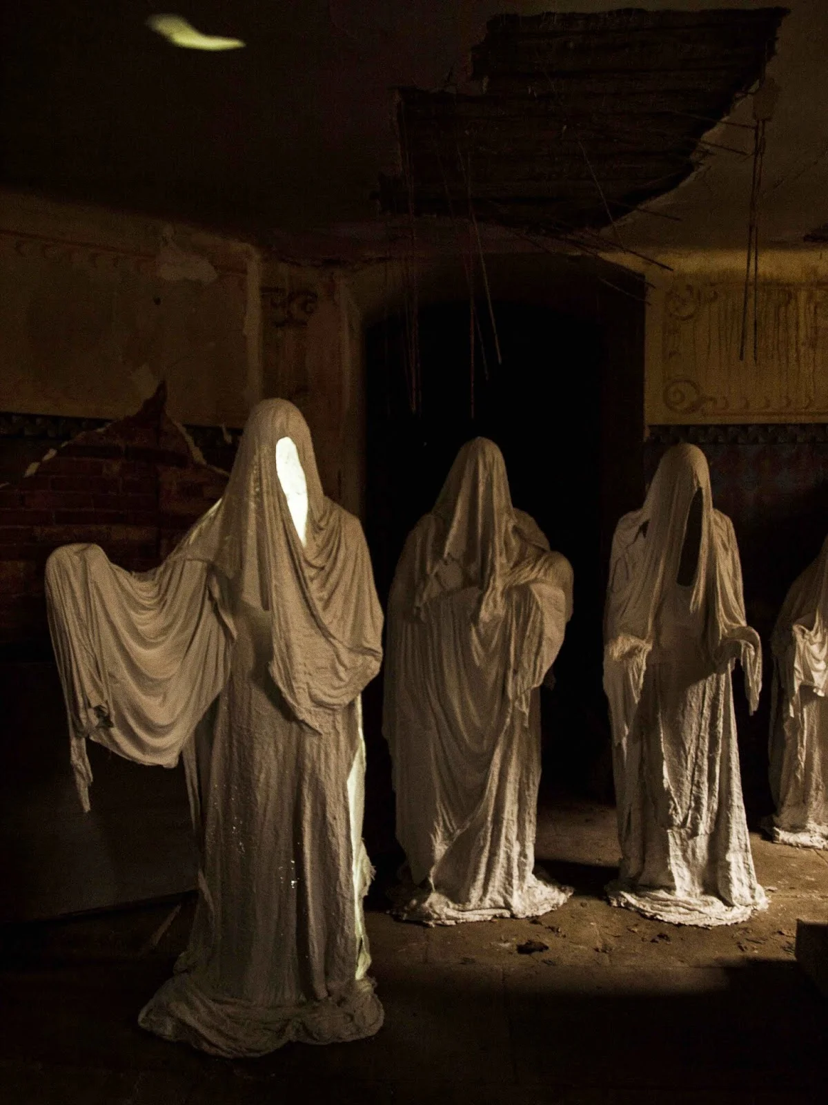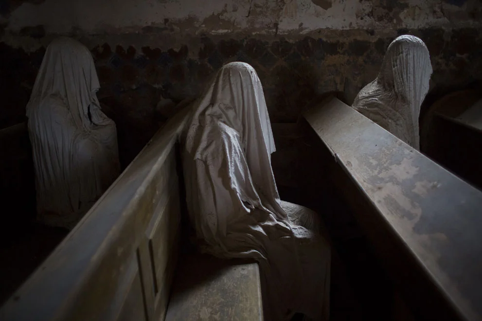 When the roof of St George’s Church in the Czech Republic collapsed during a funeral service in 1968, local residents viewed the event as a bad omen and quickly abandoned the building. The church fell into a disused, abandoned state but this summer artist Jakub Hadrava was assigned the task of reviving the 14th century site. His piece contains hooded ghostly figures which line the church pews.
